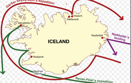 In 868, Flóki left to search for the land found by Garðar Svavarsson way up in the north.[1] He was accompanied by his family on his journey; his wife was named Gró and his children included Oddleifur and Þjóðgerður. From Western Norway he set sail to the Shetland Islands where it is said his daughter drowned. He continued his journey and landed in the Faroe Islands where another of his daughters was wed. There he took three ravens to help him find his way to Iceland, and thus, he was nicknamed Raven-Flóki (Old Norse and Icelandic: Hrafna-Flóki) and he is commonly remembered by that name.[2][3]
